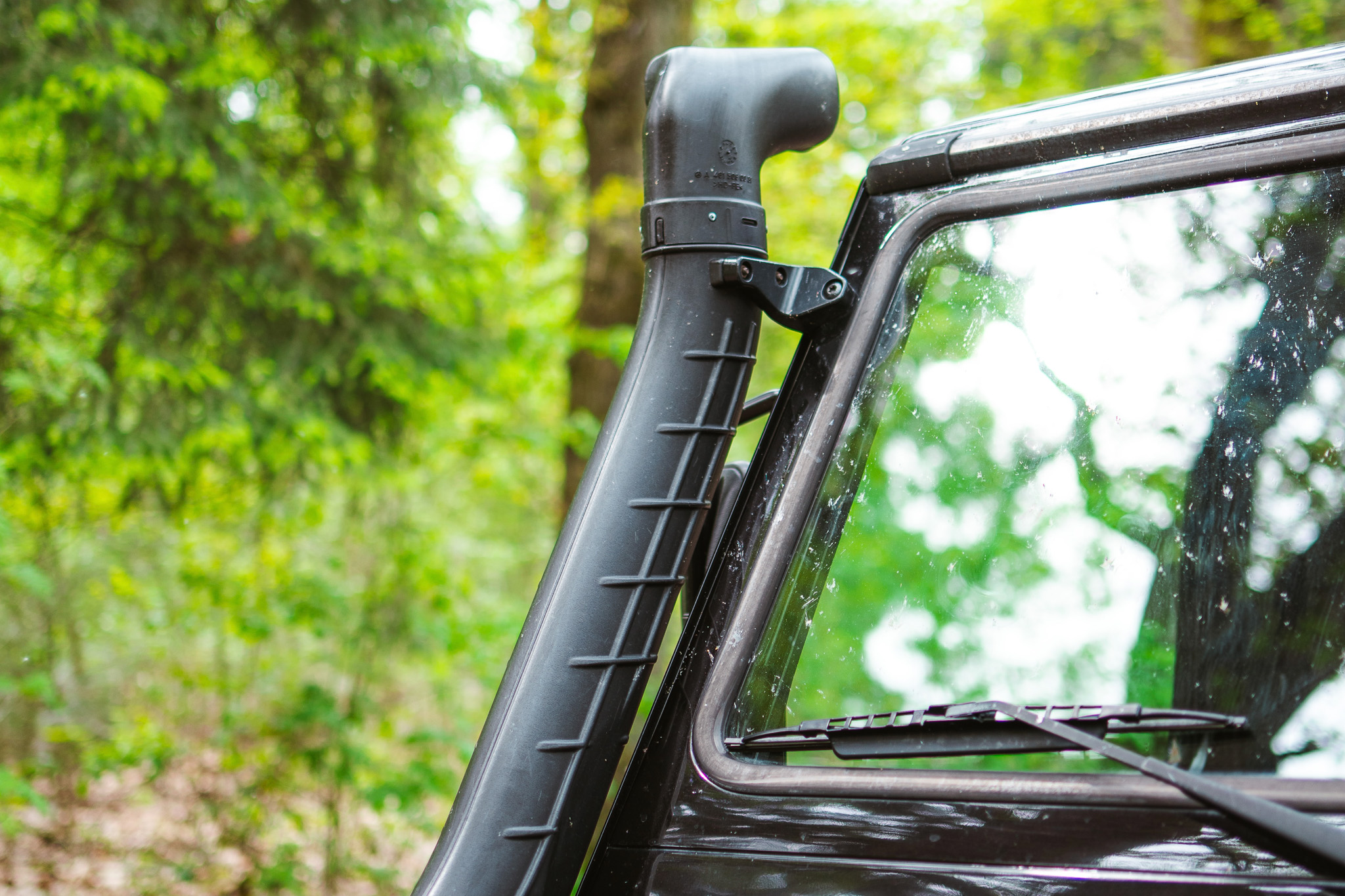 De snorkel die wij hebben gemonteerd op deze G klasse is om de luchtinlaat van de motor te verhogen. Het verhoogt de capaciteit van de motor om waterpassages te doorstaan en vermindert de kans op water- en stofschade aan de motor.